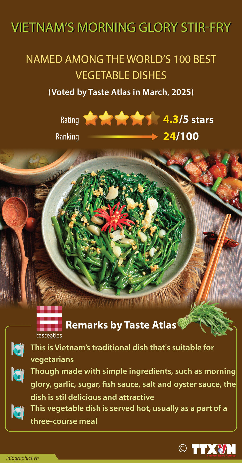 Vietnam’s morning glory stir-fry was recently recognized by the renowned culinary website TasteAtlas as one of the 100 most delicious vegetable dishes in the world. This rustic Vietnamese favorite earned a rating of 4.3 out of 5 stars, securing the 24th spot on the list.