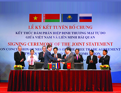 | Industry and Trade Minister Vu Huy Hoang and Trade Minister of the Asian-European Economic Committee Andrei A. Slepnev sign on December 15, 2014, a joint declaration to conclude negotiations on the FTA between Vietnam and the Customs Union__Photo: Duc Tam/VNA |