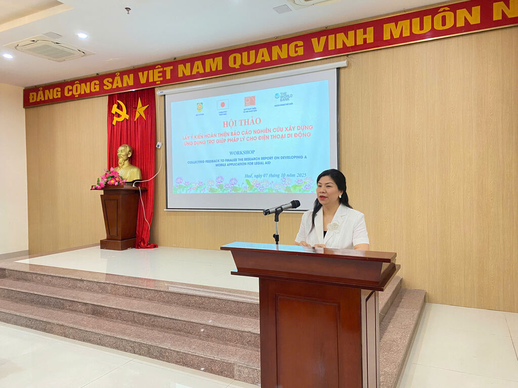 As part of the project “Enhancing Legal Aid for the Poor and Vulnerable Groups” funded by the World Bank through the Japan Social Development Fund, the Department of Law Dissemination and Education and Legal Aid under the Ministry of Justice held a consultation workshop on October 7, 2025, in Hue city to gather feedback on a research report on the development of a mobile legal aid application. The event was chaired by Deputy Director To Thi Thu Ha.